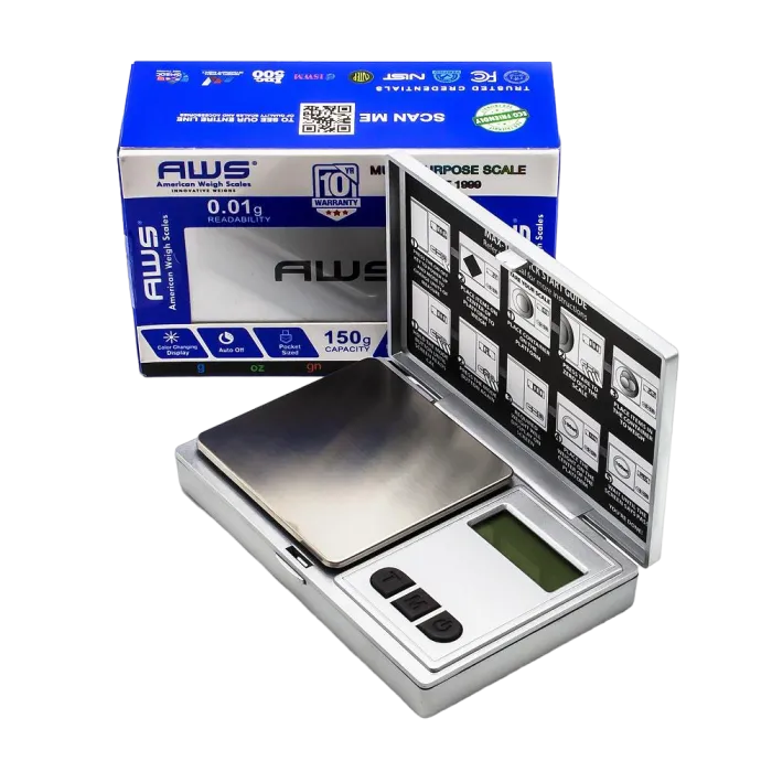 This AWS Max 150 X 0.01g compact digital food scale has a stainless-steel surface and is easy to clean. Measure ingredients, herbs, coin jewelry, and more with high-precision sensors that take accurate measurements every time. Keep your scale safe with its built-in durable cover — and get into a healthy routine with this handy tool.