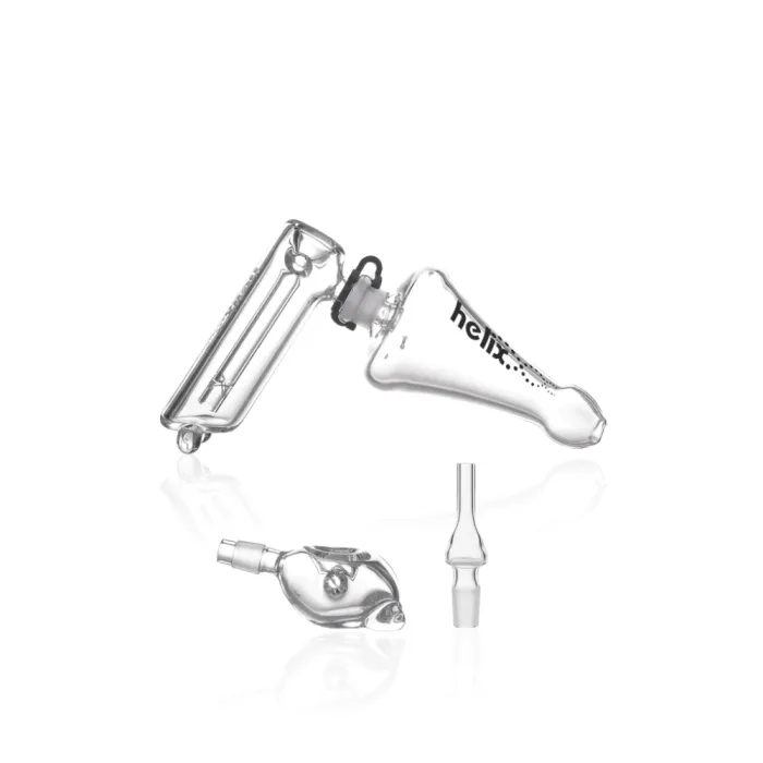 The Helix™ Multi-Purpose Kit is 8" long and made on 32mm tubing. Its Venturi chamber mouthpiece features three air intake holes that cool and spin smoke. The kit's three attachments pair with the mouthpiece: a spoon head designed for use with plant matter, a hammer bubbler head designed to offer water filtration, and a vapor nozzle designed for use with plant extract. The connection between an attachment and the mouthpiece is secured by a 14mm plastic joint clamp. The kit includes everything necessary to build all three assemblies, and the bubbler attachment functions best with approximately 0.5" of water.