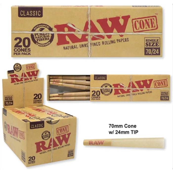 These RAW Classic Cones are single size and are perfect for smoking all by yourself without needing to pass. Each cone comes with a built-in tip and its own funnel for easy filling. The display contains single pack with 20 cones in each. Made with natural plant fiber and naturally unbleached.