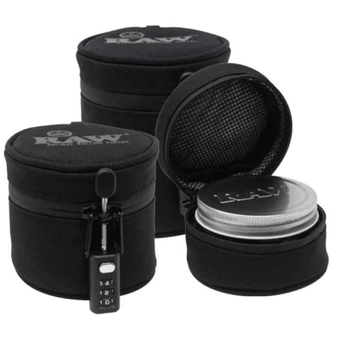 Upgrade your stash from a regular mason jar to the RAW Smell Proof Jar & Cozy. This setup features a 5-layer case that keeps smells in and meddling folks out! The case is padded to reduce breakage if dropped and the black color blocks out UV rays to keep your buds fresh for longer. A combination lock is included to make this setup child (and roommate) proof. Available in 6oz, 10oz, and 16oz sizes.