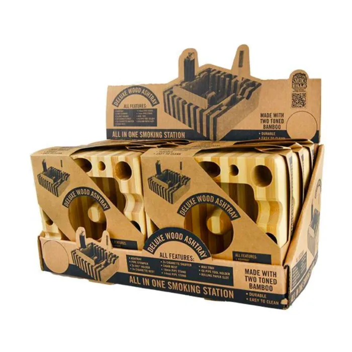 This deluxe wood ashtray made of two tone bamboo. which is then been smoothly sanded to a gorgeous outer finish and shaped into a 5" x 5" square to sit stably on any surface. The ashtray's raised center acts as place to "tap" your pipe or bowl -- clearing out ash and resin for a cleaner hit. It features tons of built in features including 2 lighter holders, 3 rests, 2 snuffers, cigar rest, rolling paper holder and more.