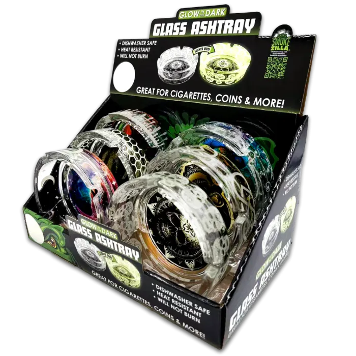 Glow in the Dark Glass Ashtray display includes a mix of various glow-in-the-dark designs printed on both the bottom and edges. Dishwasher safe, heat resistant — will not burn. Great for cigarettes, coins, and more!