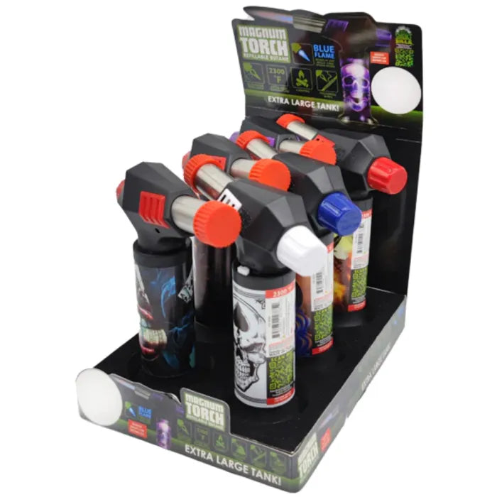 Printed Magnum Torch lighter has a 2300° flame, strong enough for any task! Great for camping, bronzing metal, soldering wires, flaming food, and more! Works at any angle, even upside down! Comes with a built-in safety lock.