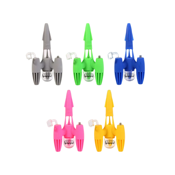Introducing the Skylab silicone water pipe by STRIO, a versatile and striking smoking apparatus that is perfect for both wax and dry herb. Whether you're a seasoned smoker or a beginner, the Skylab offers an all-in-one solution that makes smoking a breeze. With a vibrant design that will surely turn heads, this rocket ship statement piece is sure to be the centerpiece of any smoking collection.